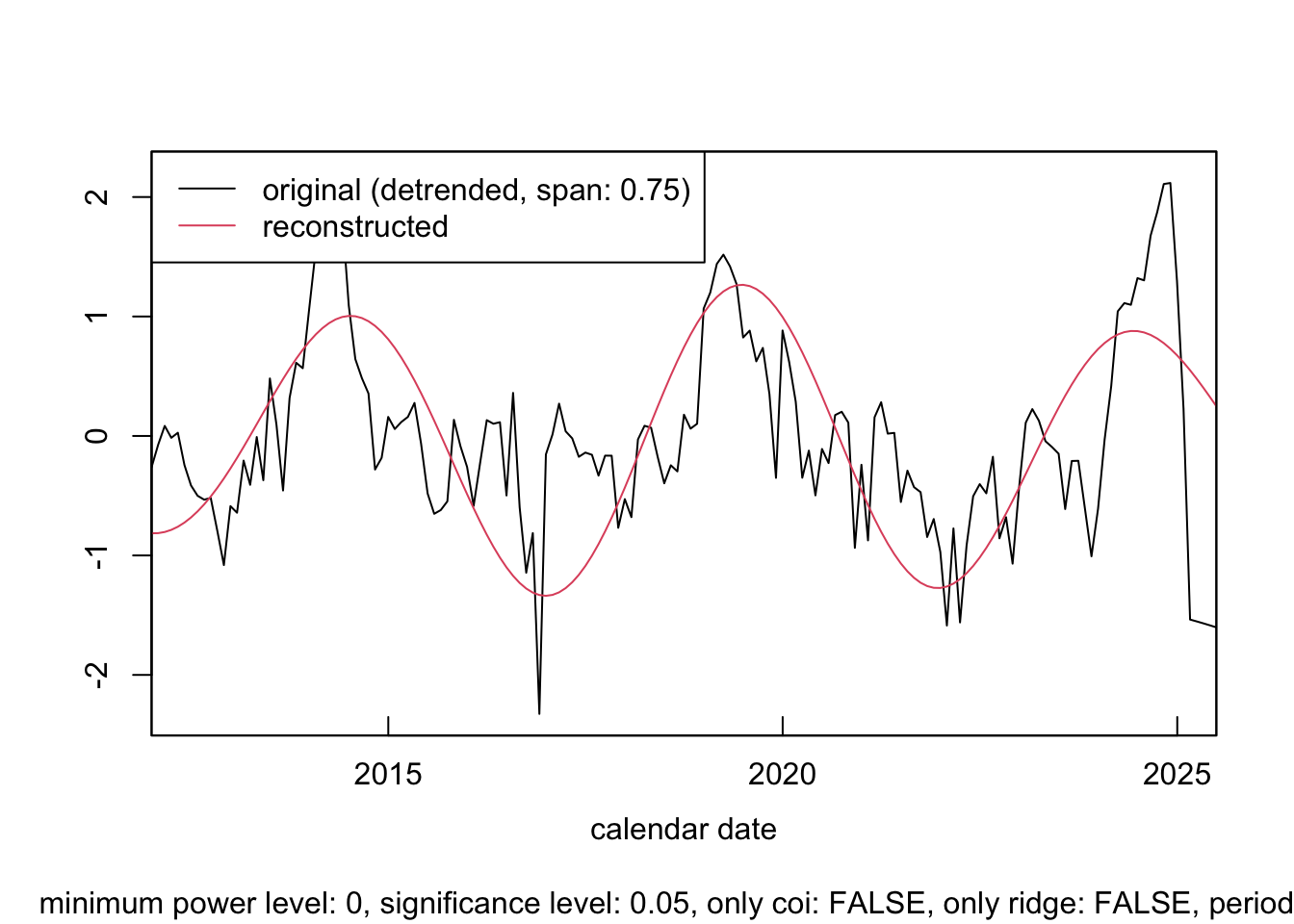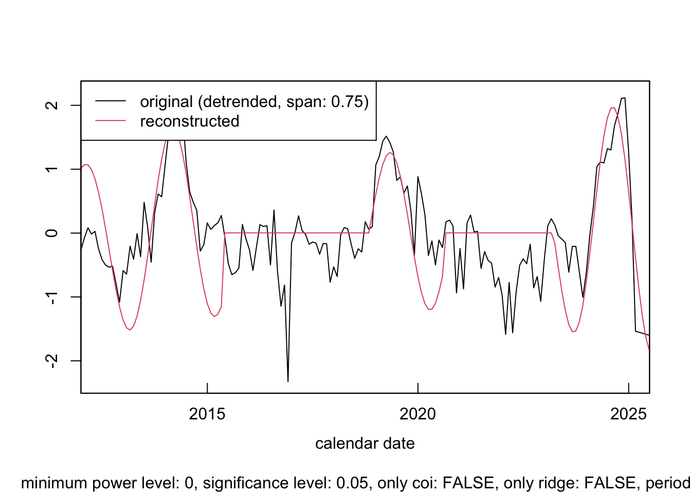 Compute and inspect the period-specific synchrony: check how closely the 2 time series align.