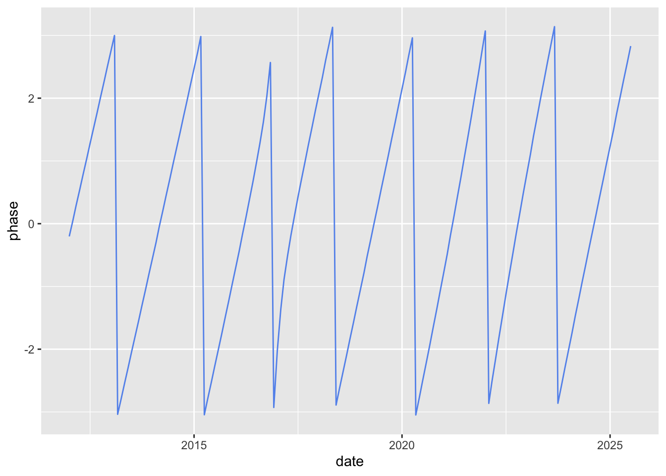 # get the column for the 2-year periodrow_2year <-which.min(abs(wavelet$Period -2))data.frame(date = wavelet$series$date,phase = wavelet$Phase[row_2year,]) %>%ggplot() +geom_line(aes(x = date,y = phase ), color ="cornflowerblue" )