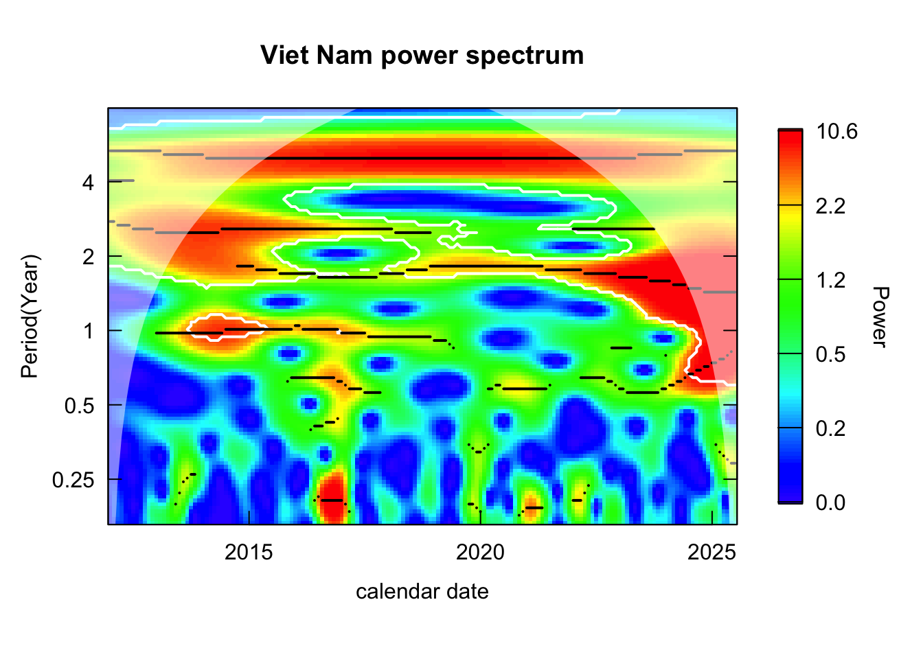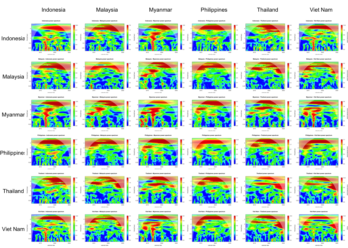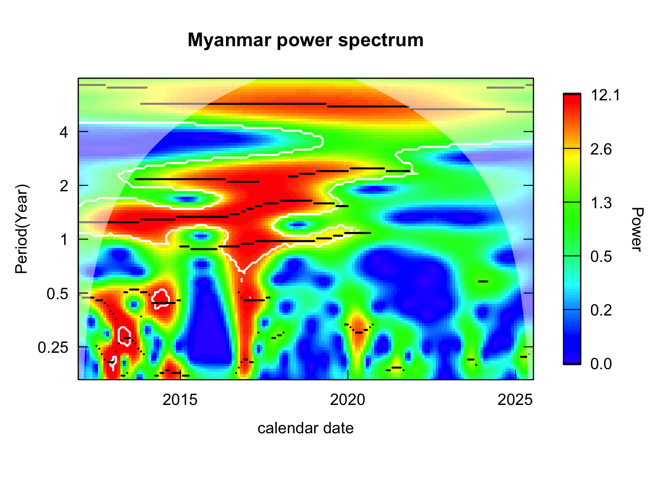 analyze_countries <-c("Thailand", "Myanmar", "Philippines", "Viet Nam", "Malaysia", "Indonesia")countries_wavelets <- log_transformed %>%filter(country %in% analyze_countries) %>%group_by(country) %>%nest() %>%mutate(wavelet =map(data, \(dat){capture.output( out <- dat %>%analyze.wavelet(my.series ="incidence",dt =1/12, # 1 time unit = 1 year lowerPeriod =1/6, # 2 monthsupperPeriod =8, # yearsverbose =FALSE ) ) %>%invisible() out }) ) %>%select(country, wavelet) %>%deframe()