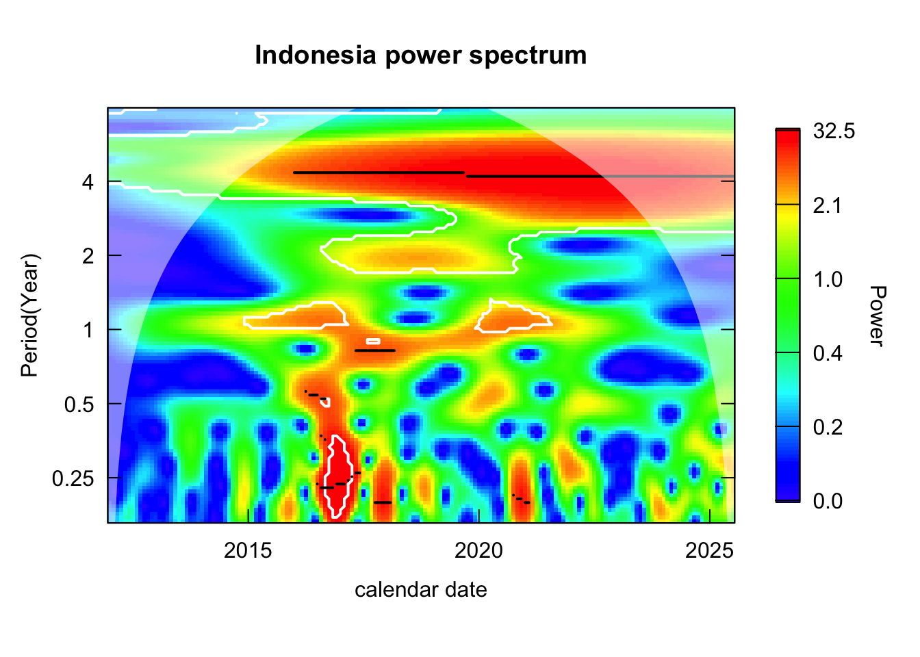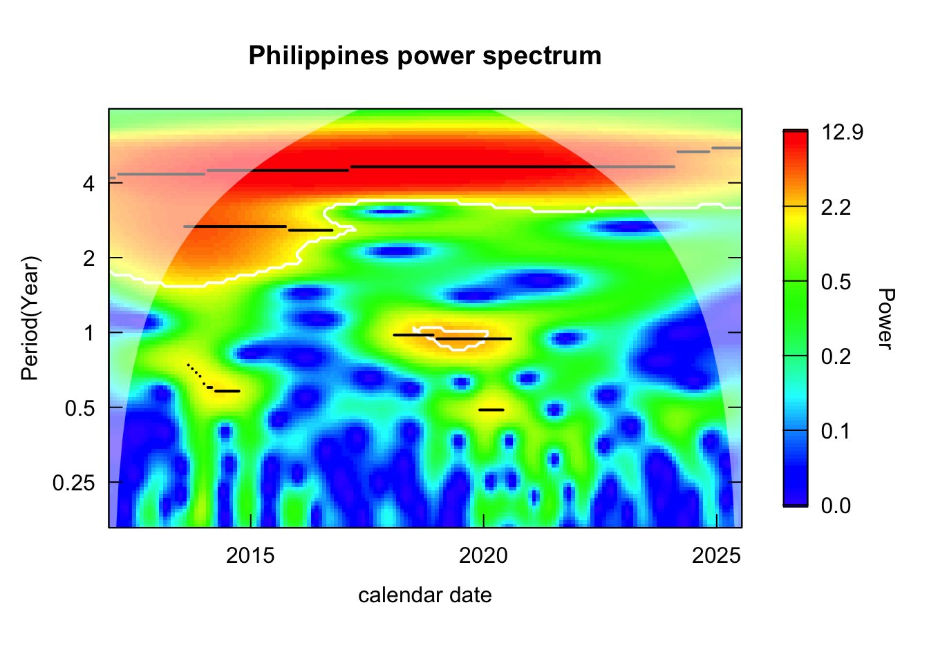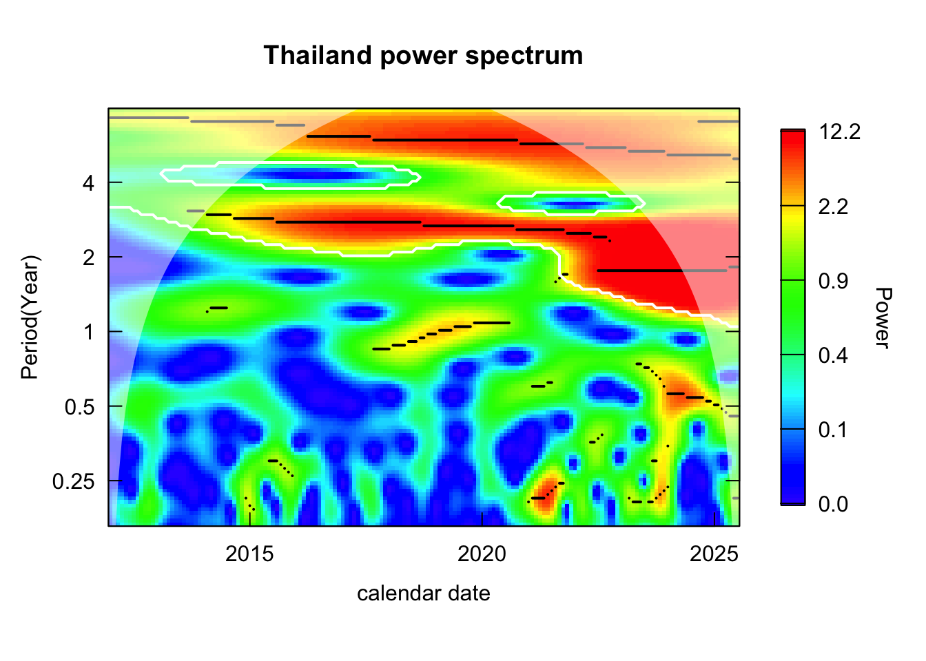 analyze_countries <-c("Thailand", "Myanmar", "Philippines", "Viet Nam", "Malaysia", "Indonesia")countries_wavelets <- log_transformed %>%filter(country %in% analyze_countries) %>%group_by(country) %>%nest() %>%mutate(wavelet =map(data, \(dat){capture.output( out <- dat %>%analyze.wavelet(my.series ="incidence",dt =1/12, # 1 time unit = 1 year lowerPeriod =1/6, # 2 monthsupperPeriod =8, # yearsverbose =FALSE ) ) %>%invisible() out }) ) %>%select(country, wavelet) %>%deframe()