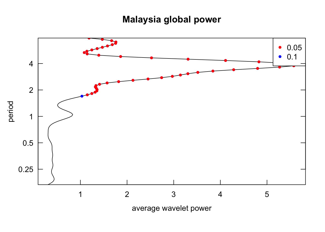 Inspect the global power (time-averaged power, analogue of the Fourier transform): identify the overall dominant periodicities.