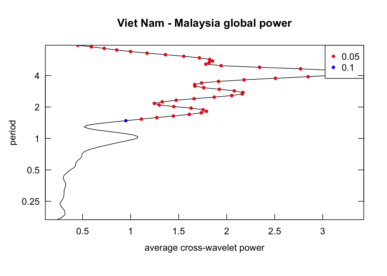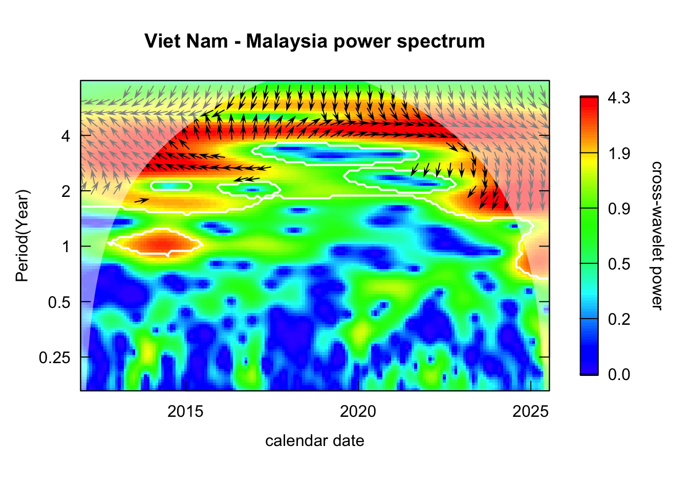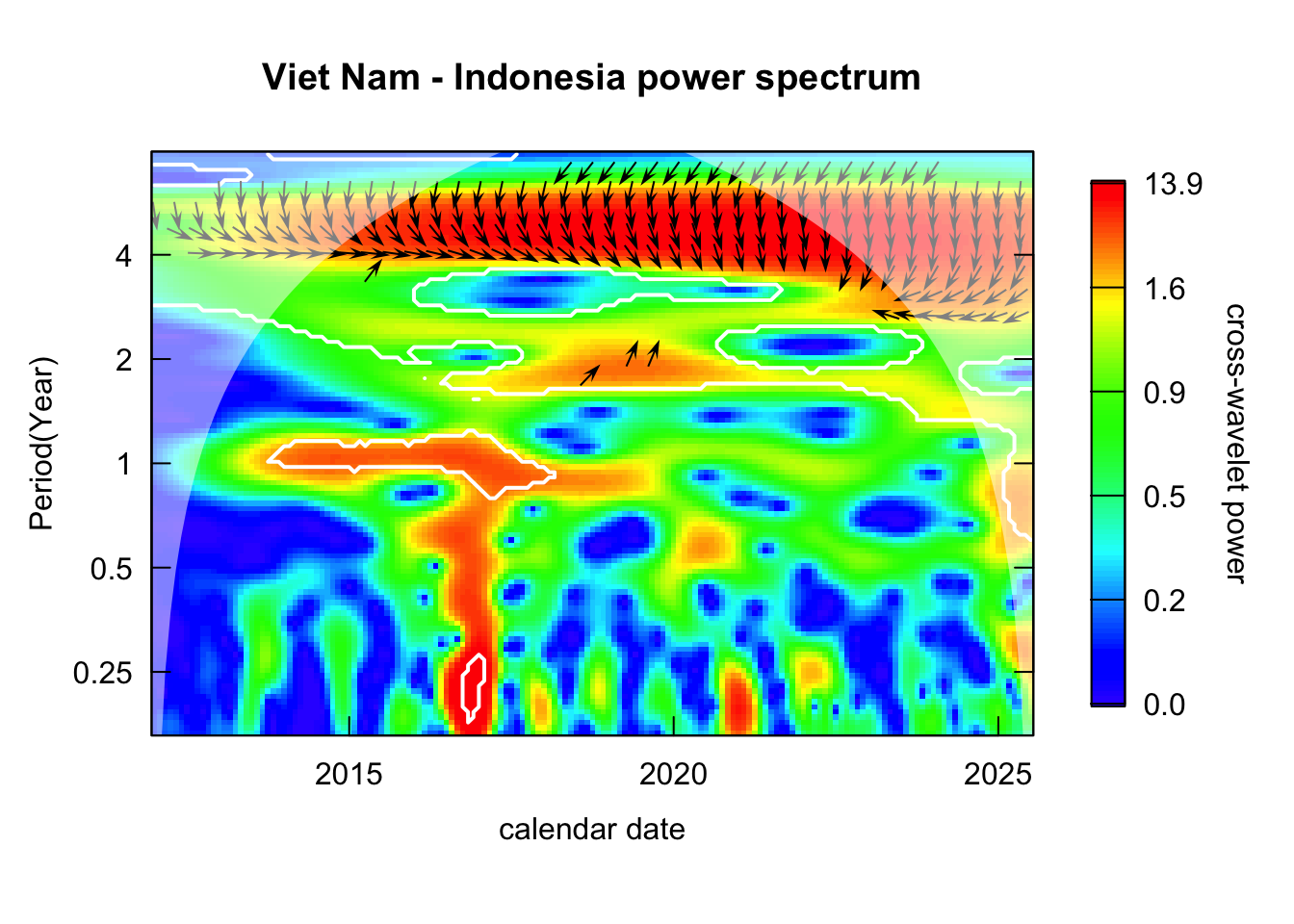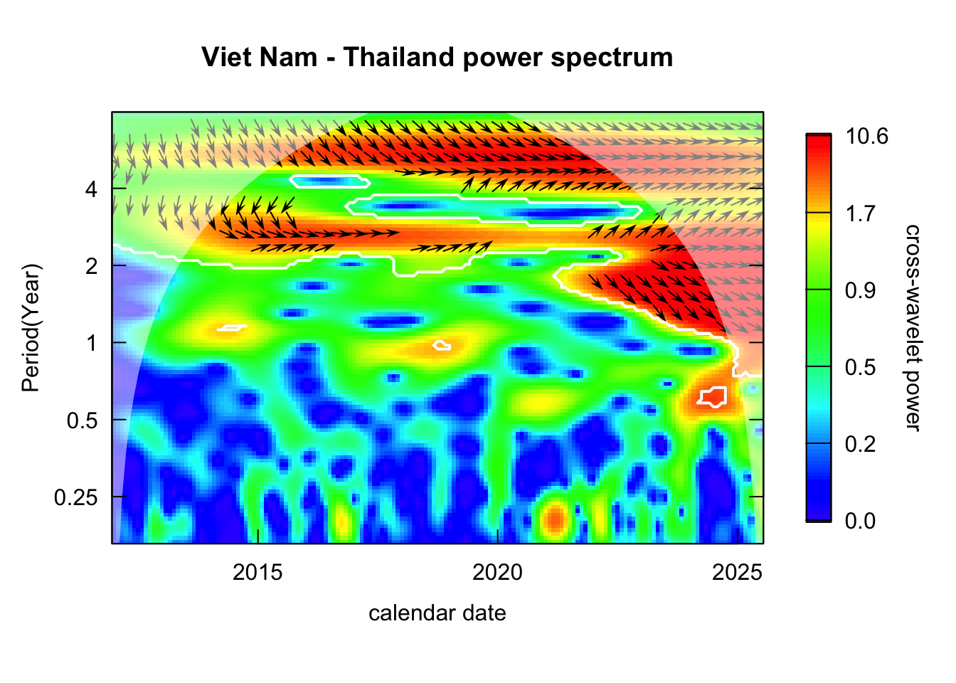 Inspect the cross-wavelet power spectrum: identify the period that consistently recurring for both pair of time series.