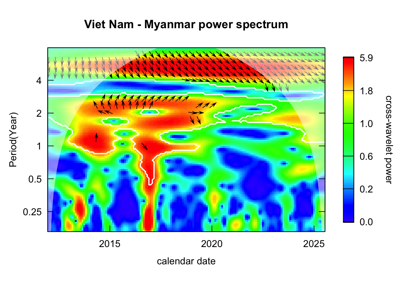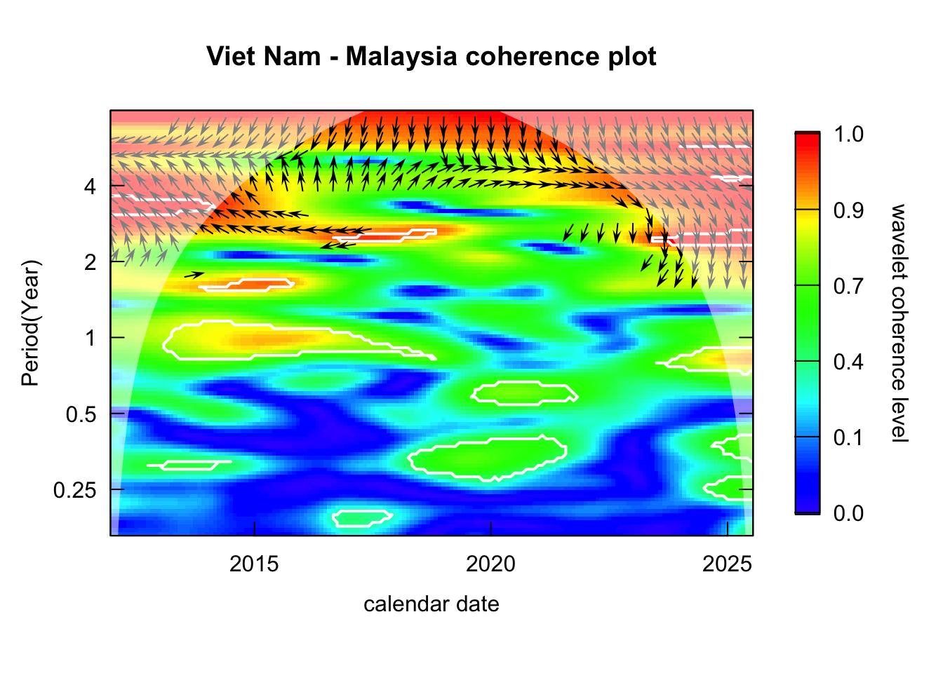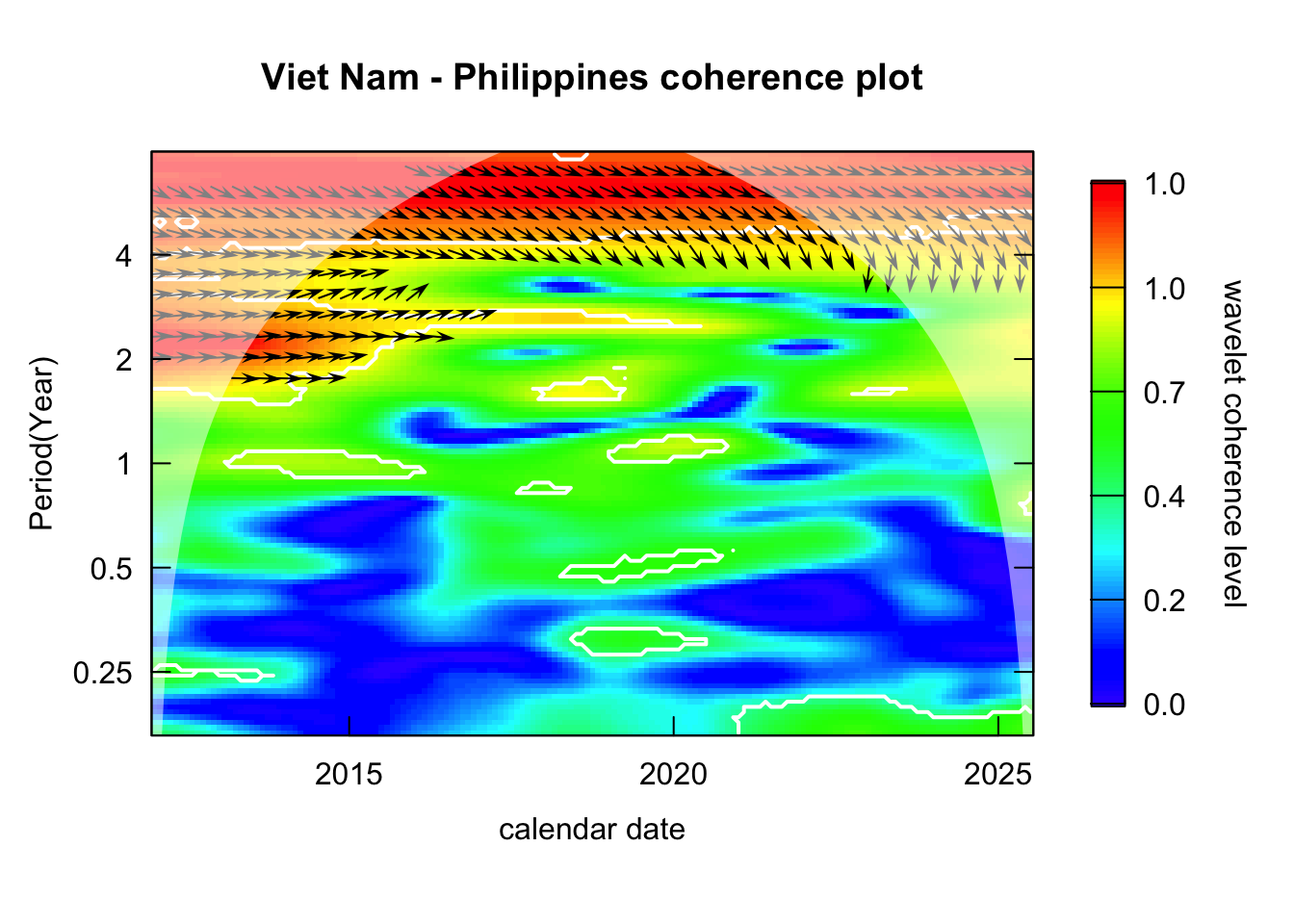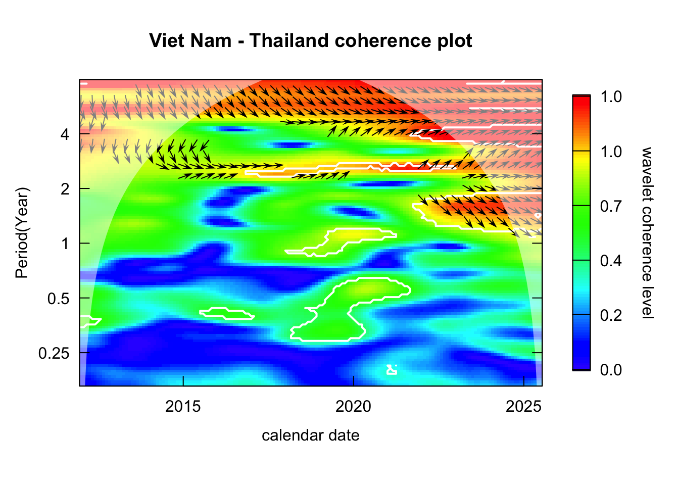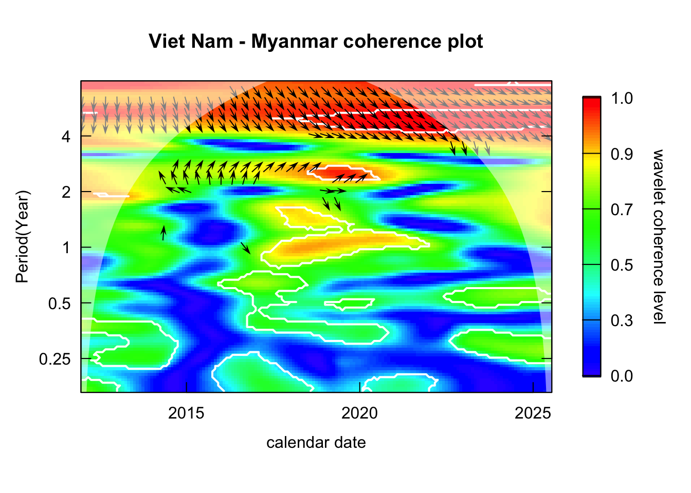 library(janitor)# Function that takes data instead of wavelets# wavelets, period = 5, ref_country = "Viet Nam", constraint = TRUE, diff_to_time = TRUE# when ref_country is not found, generate all unique pairs # when repeated = TRUE, included permutations of pairs intead of combinationsgenerate_biwavelet_analysis <-function(data, ref_country ="Viet Nam",repeated =FALSE,verbose =FALSE){ countries <-unique(data$country)# generate all unique pairs pairs <-if(!repeated) combn(countries, 2, simplify =FALSE) elseexpand.grid(countries, countries) %>%filter(Var1 != Var2) %>%apply(1, \(row){as.character(row)}, simplify =FALSE)# if ref country is provided, keep pairs with the ref_country# also make sure ref country is the first time seriesif (!is.na(ref_country)){ pairs <-keep(pairs, \(p) ref_country %in% p) pairs <-map(pairs, \(p) {if (p[1] == ref_country) p elserev(p) }) } coherence <-map(pairs, \(curr_pair){capture.output( out <- data %>%filter( country %in% curr_pair ) %>%select(country, date, incidence) %>%pivot_wider(names_from = country,values_from = incidence ) %>%as.data.frame() %>%analyze.coherency(my.pair = curr_pair,dt =1/12,lowerPeriod =1/6,upperPeriod =8,verbose = verbose ) ) %>%invisible() out })names(coherence) <-map_chr(pairs, \(pair) paste(pair, collapse =" - ")) coherence}