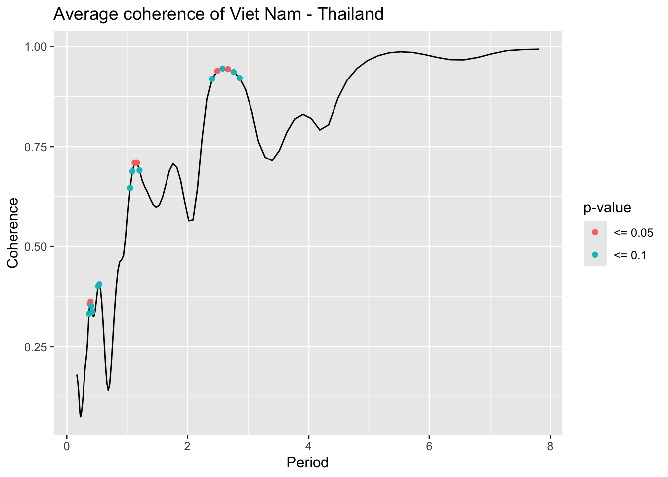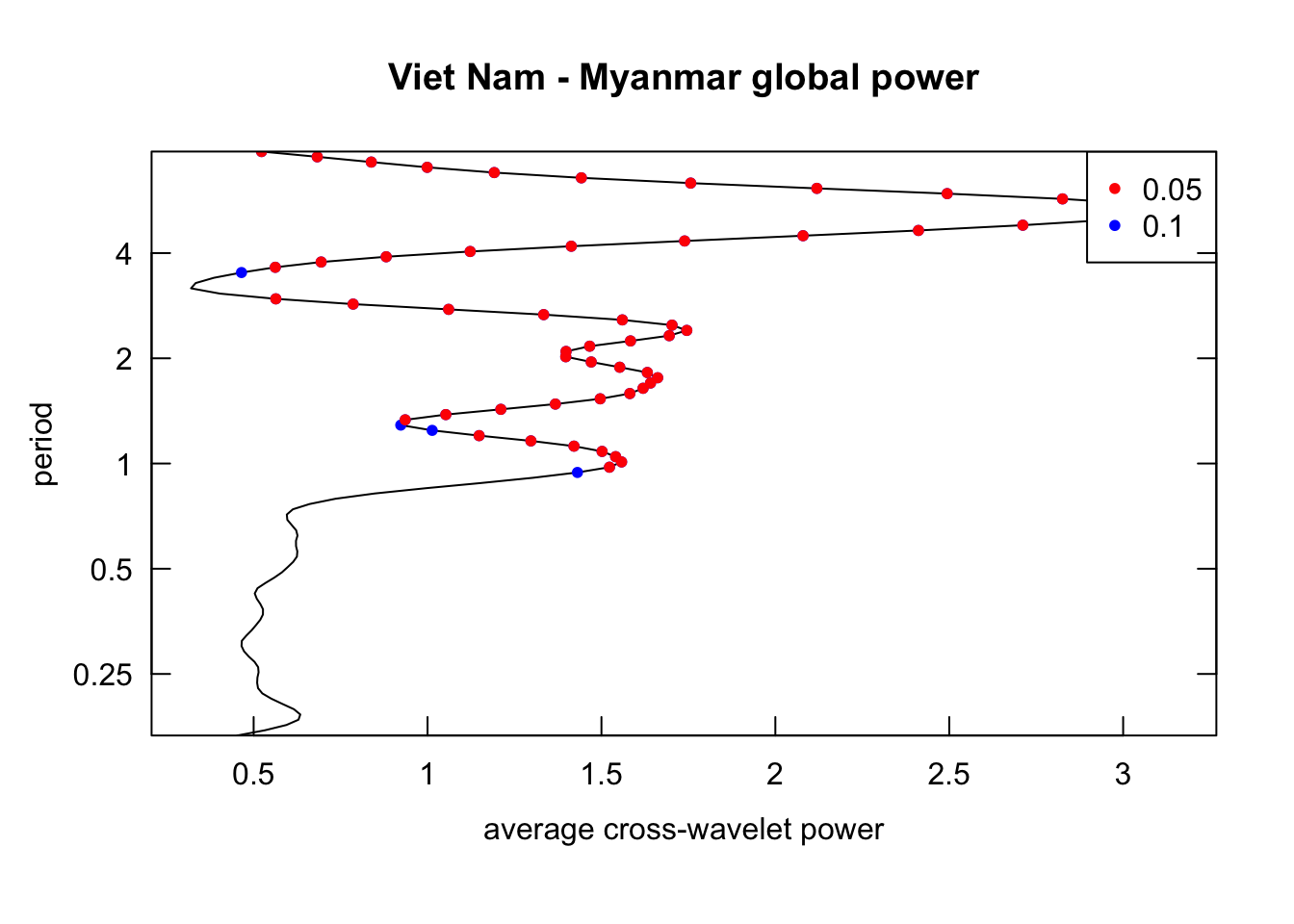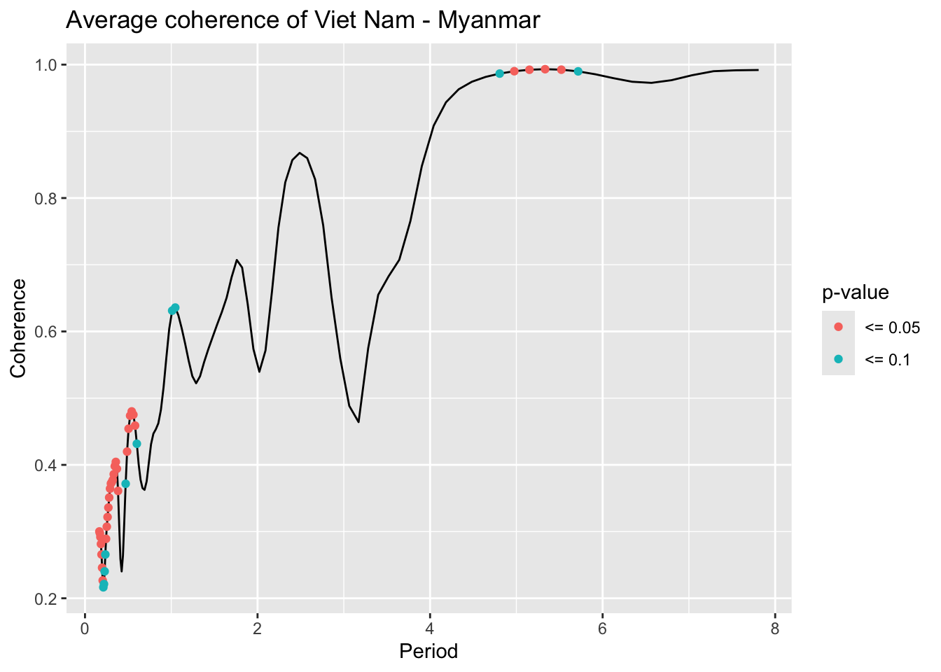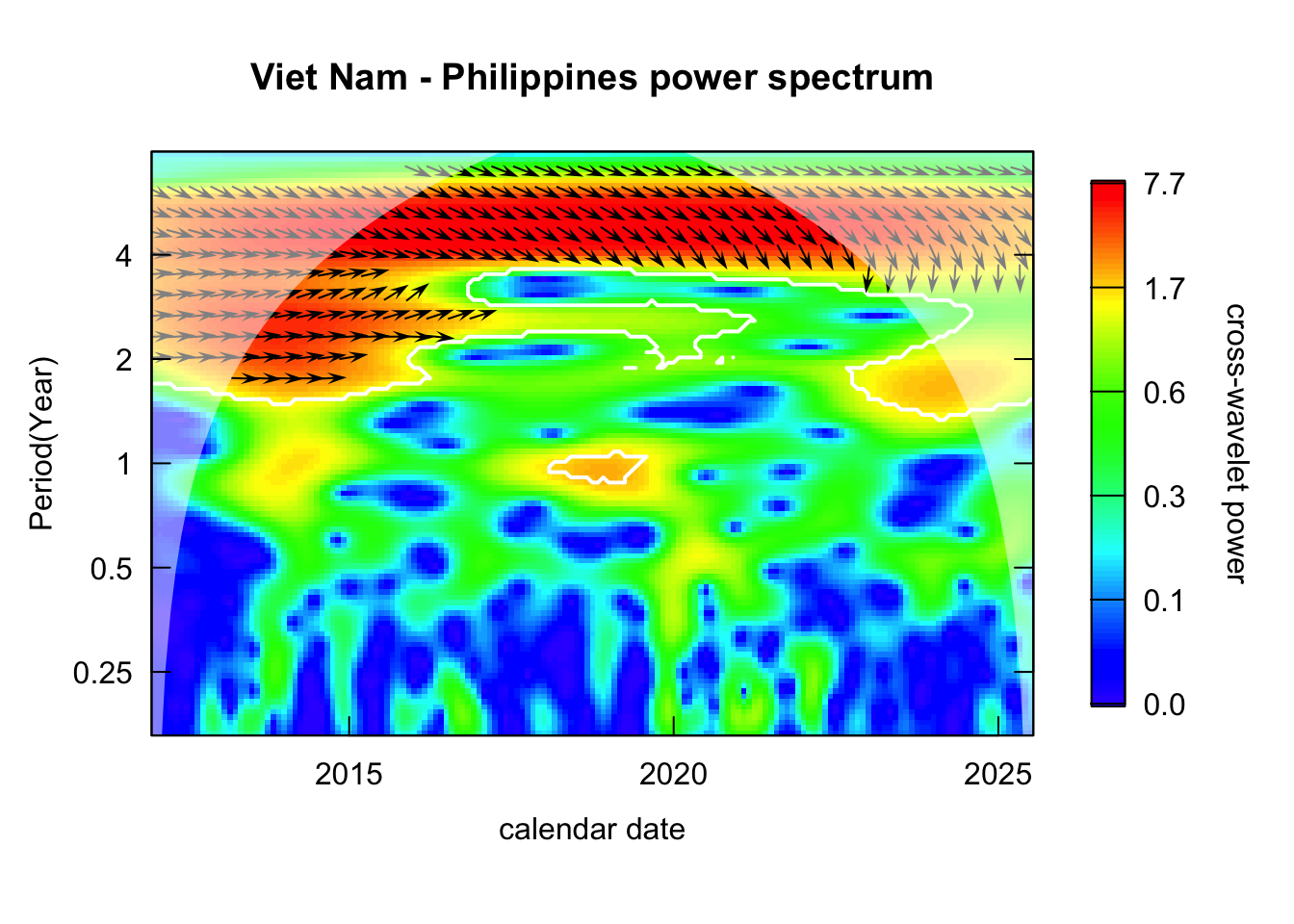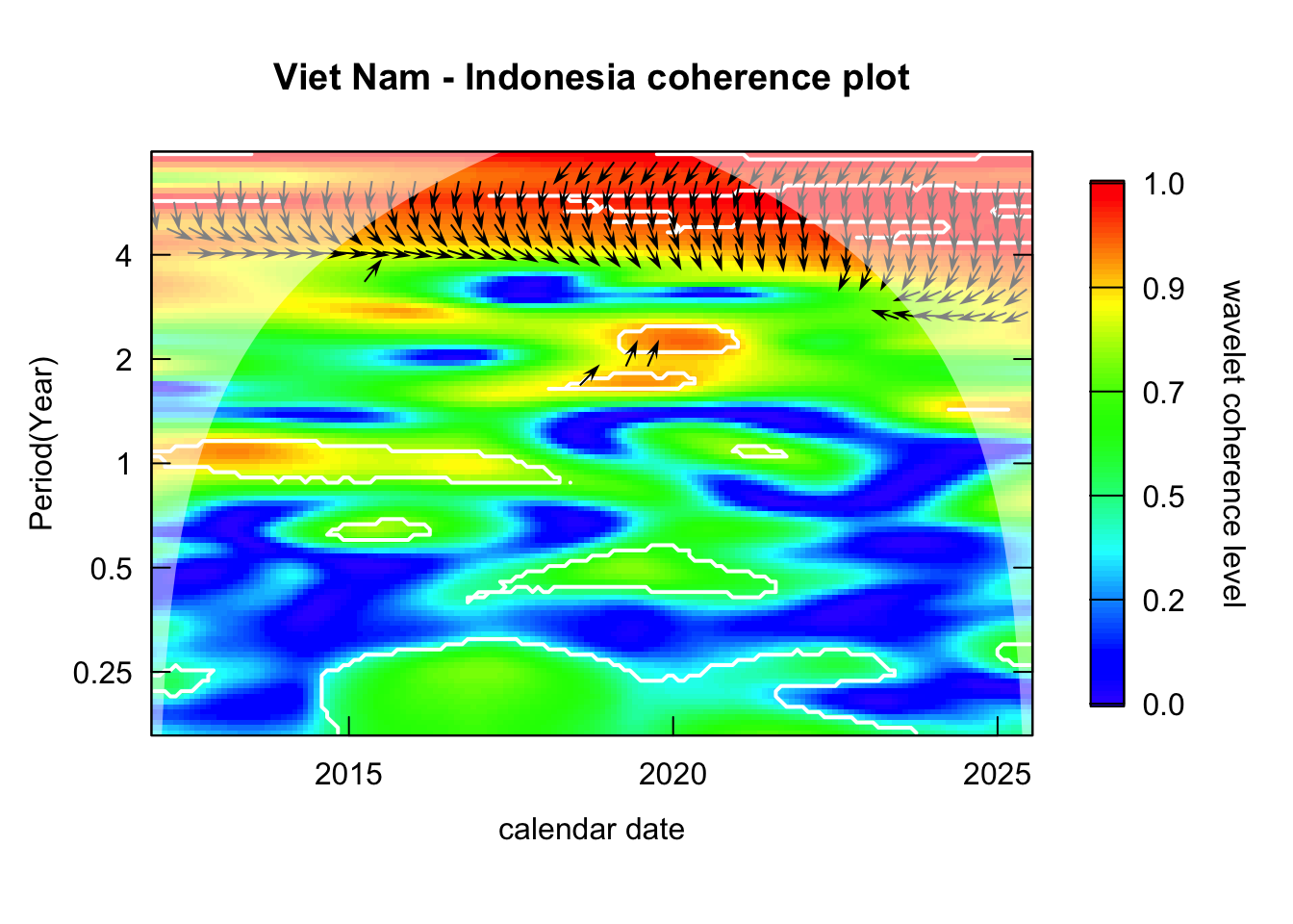 library(janitor)# Function that takes data instead of wavelets# wavelets, period = 5, ref_country = "Viet Nam", constraint = TRUE, diff_to_time = TRUE# when ref_country is not found, generate all unique pairs # when repeated = TRUE, included permutations of pairs intead of combinationsgenerate_biwavelet_analysis <-function(data, ref_country ="Viet Nam",repeated =FALSE,verbose =FALSE){ countries <-unique(data$country)# generate all unique pairs pairs <-if(!repeated) combn(countries, 2, simplify =FALSE) elseexpand.grid(countries, countries) %>%filter(Var1 != Var2) %>%apply(1, \(row){as.character(row)}, simplify =FALSE)# if ref country is provided, keep pairs with the ref_country# also make sure ref country is the first time seriesif (!is.na(ref_country)){ pairs <-keep(pairs, \(p) ref_country %in% p) pairs <-map(pairs, \(p) {if (p[1] == ref_country) p elserev(p) }) } coherence <-map(pairs, \(curr_pair){capture.output( out <- data %>%filter( country %in% curr_pair ) %>%select(country, date, incidence) %>%pivot_wider(names_from = country,values_from = incidence ) %>%as.data.frame() %>%analyze.coherency(my.pair = curr_pair,dt =1/12,lowerPeriod =1/6,upperPeriod =8,verbose = verbose ) ) %>%invisible() out })names(coherence) <-map_chr(pairs, \(pair) paste(pair, collapse =" - ")) coherence}