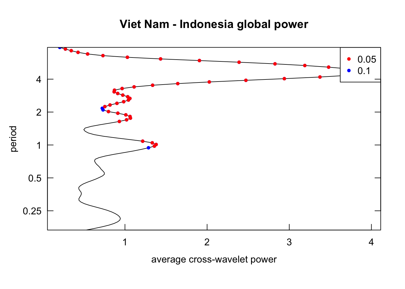 plot_cwavelet_power <-function(coherence_list){# return heatmap of power and also global powerimap(coherence_list, \(coherence, label){wc.image( coherence,# set significance level for drawing contour (white line around an area)siglvl.contour =0.1, # set significance level for drawing arrowssiglvl.arrow =0.05, which.arrow.sig ="wt",main =paste0(label, " power spectrum"),legend.params =list(lab ="cross-wavelet power"),periodlab ="Period(Year)",show.date =TRUE ) spectrum <-recordPlot()wc.avg( coherence,main =paste0(label, " global power") ) global_power <-recordPlot()list("spectrum"= spectrum,"global_power"= global_power ) })}