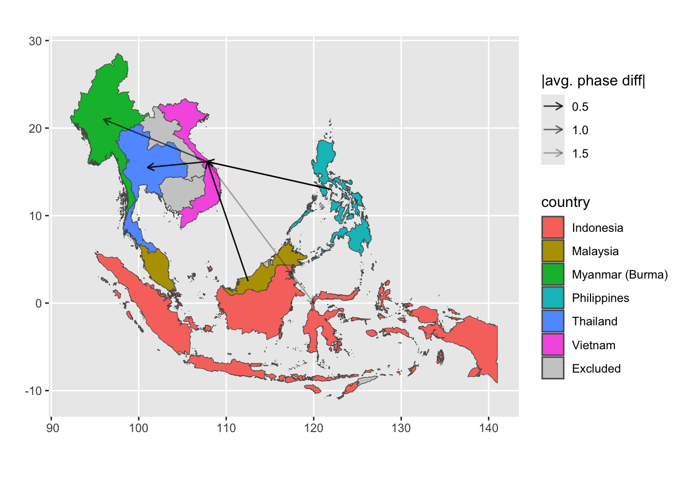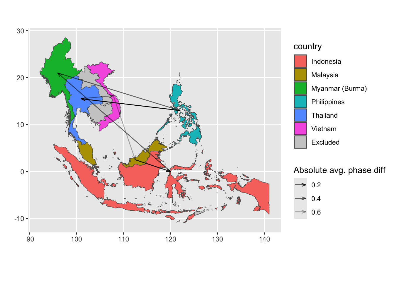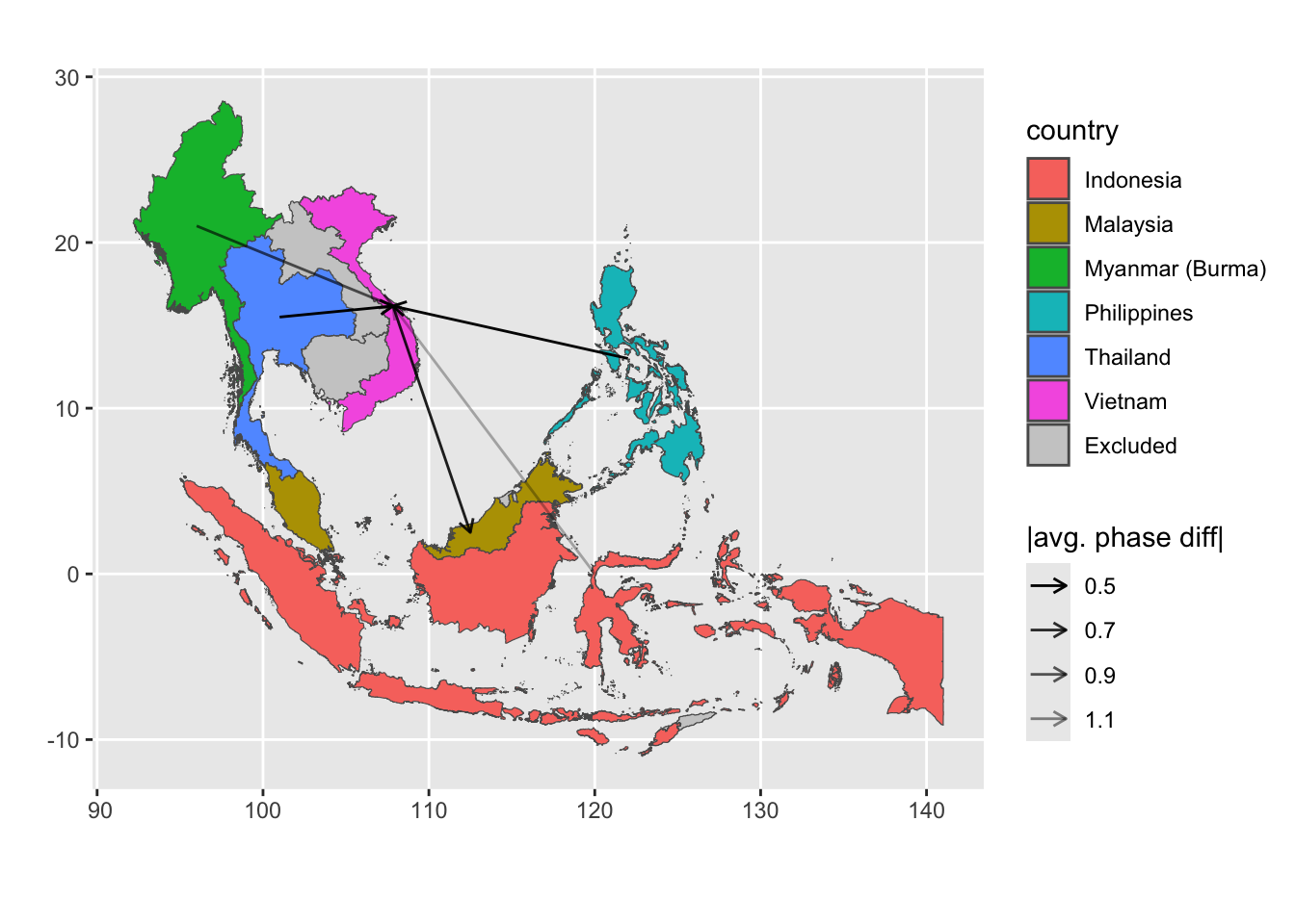 # expected input to be the output from function compute_synchronyprepare_plot_data <-function(synchrony_out, centroid_df = iso_centroid){ synchrony_out$df %>%# ---- compute mean coherence-weighted phase differencegroup_by(label) %>%summarize(avg_phase_diff =sum(coherence * phase_diff)/sum(coherence) ) %>%separate(label, into =c("from", "to"), sep =" - ") %>%mutate(from =countrycode(from, origin ="country.name", destination ="iso3c"),to =countrycode(to, origin ="country.name", destination ="iso3c") ) %>%# ---- swap from and to countries if the avg_phase_diff is negative (i.e. the "to" is actually the leading time series)mutate(tmp =if_else(avg_phase_diff <0, from, to),from =if_else(avg_phase_diff <0, to, from),to = tmp,# since we already use the sign for determine the direction, keep absolute value onlyavg_phase_diff =abs(avg_phase_diff) ) %>%select(-tmp) %>%# ---- get the coordinate of the centroid of each countryleft_join(# get coordinate of centroid of origin country centroid_df %>%rename(from_x = x, from_y = y),by =join_by(from == iso) ) %>%left_join(# get coordinate of centroid of destination country centroid_df %>%rename(to_x = x, to_y = y),by =join_by(to == iso) )}# get data.frame of iso and coordinate of centroid of that country# iso_centroid <- map_data %>% # as_tibble() %>% # mutate(# centroid = st_coordinates(st_point_on_surface(sf.geometry)),# x = centroid[,"X"],# y = centroid[,"Y"]# ) %>% # select(iso, x, y)# try centroid from CoordinateCleaner packageiso_centroid <- countryref %>%filter( iso3 %in% sea_iso, type =="country" ) %>%# for each country, only keep the first recordgroup_by(iso3) %>%slice(1) %>%ungroup() %>%rename(iso = iso3,x = centroid.lon,y = centroid.lat ) %>%select(iso, x, y)