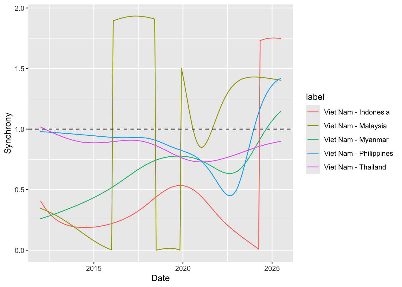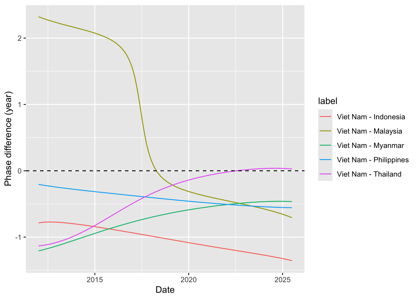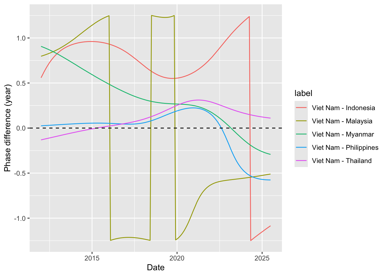 # expected input to be the output from function compute_synchronyprepare_plot_data <-function(synchrony_out, centroid_df = iso_centroid){ synchrony_out$df %>%# ---- compute mean coherence-weighted phase differencegroup_by(label) %>%summarize(avg_phase_diff =sum(coherence * phase_diff)/sum(coherence) ) %>%separate(label, into =c("from", "to"), sep =" - ") %>%mutate(from =countrycode(from, origin ="country.name", destination ="iso3c"),to =countrycode(to, origin ="country.name", destination ="iso3c") ) %>%# ---- swap from and to countries if the avg_phase_diff is negative (i.e. the "to" is actually the leading time series)mutate(tmp =if_else(avg_phase_diff <0, from, to),from =if_else(avg_phase_diff <0, to, from),to = tmp,# since we already use the sign for determine the direction, keep absolute value onlyavg_phase_diff =abs(avg_phase_diff) ) %>%select(-tmp) %>%# ---- get the coordinate of the centroid of each countryleft_join(# get coordinate of centroid of origin country centroid_df %>%rename(from_x = x, from_y = y),by =join_by(from == iso) ) %>%left_join(# get coordinate of centroid of destination country centroid_df %>%rename(to_x = x, to_y = y),by =join_by(to == iso) )}# get data.frame of iso and coordinate of centroid of that country# iso_centroid <- map_data %>% # as_tibble() %>% # mutate(# centroid = st_coordinates(st_point_on_surface(sf.geometry)),# x = centroid[,"X"],# y = centroid[,"Y"]# ) %>% # select(iso, x, y)# try centroid from CoordinateCleaner packageiso_centroid <- countryref %>%filter( iso3 %in% sea_iso, type =="country" ) %>%# for each country, only keep the first recordgroup_by(iso3) %>%slice(1) %>%ungroup() %>%rename(iso = iso3,x = centroid.lon,y = centroid.lat ) %>%select(iso, x, y)