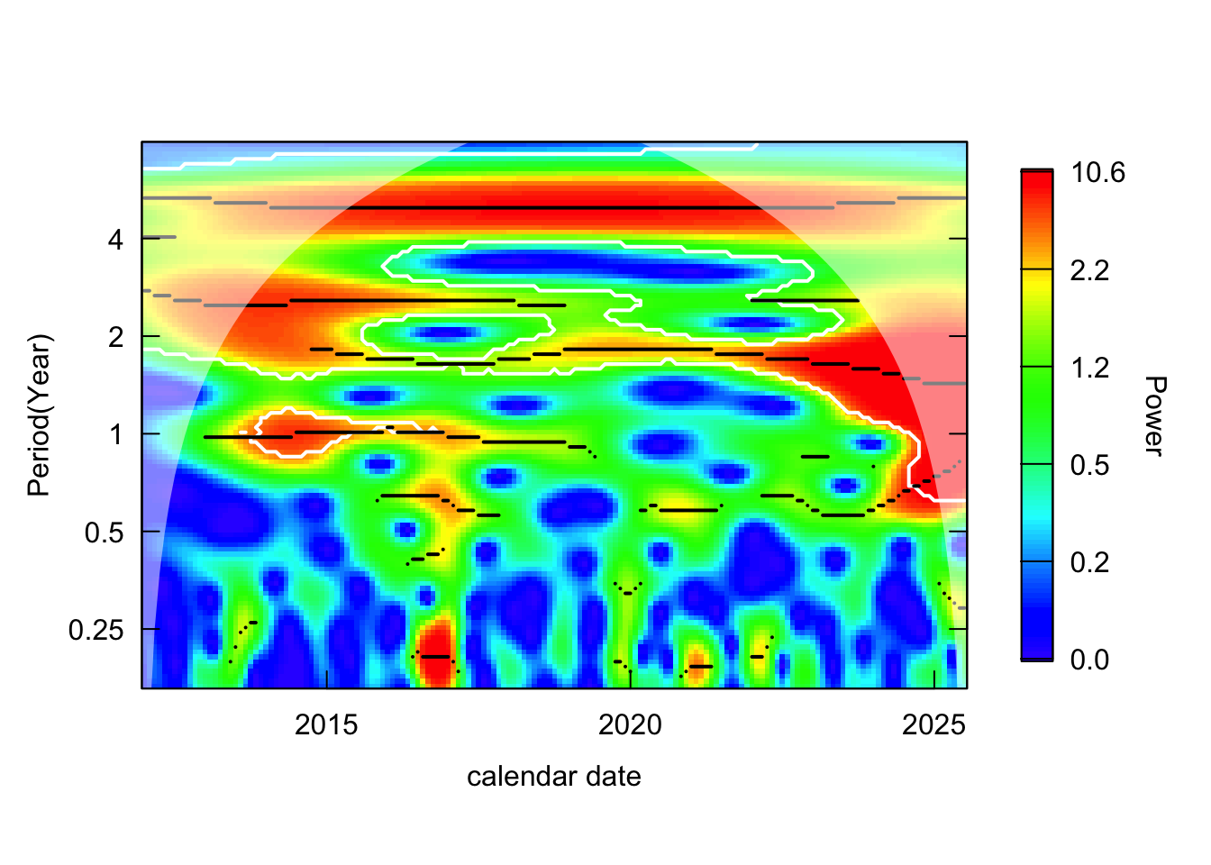 Inspect the power spectrum across time-period domain: identify the period that is consistently high over time, which indicates recurring cycles in the time series.