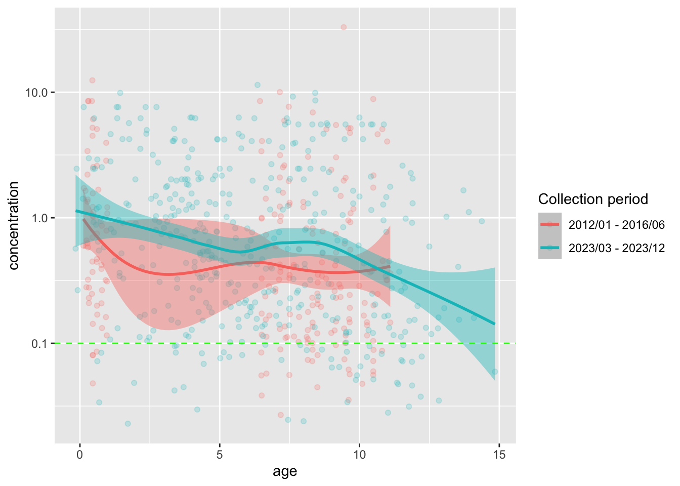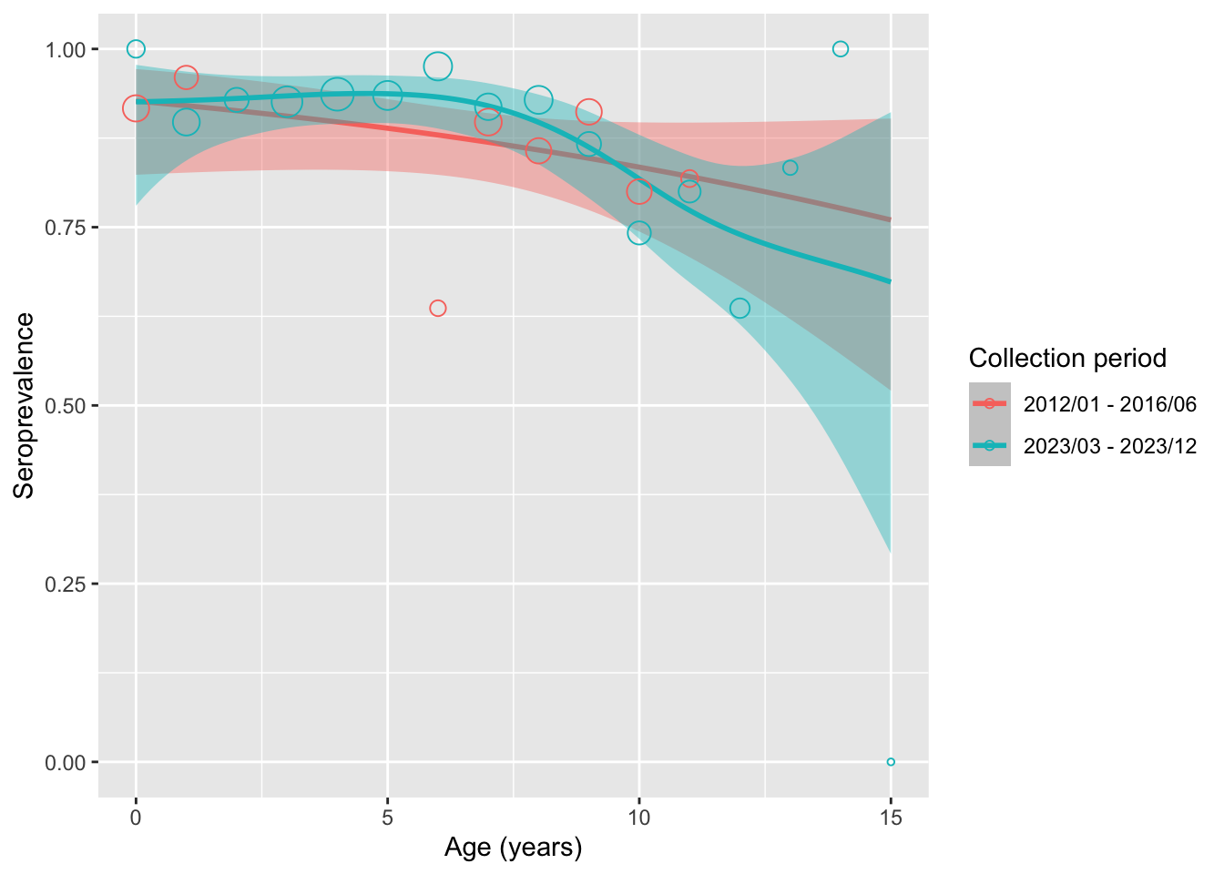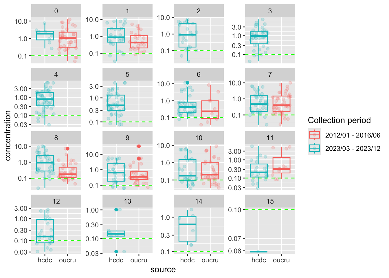 However, it may be due to the fact that the sample size for the earlier collection period (using OUCRU samples) is quite small and we don’t have any data for several age groups (3-6